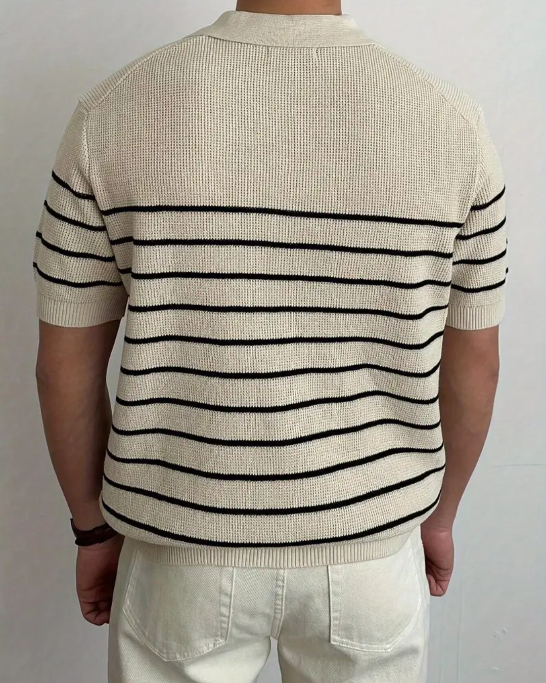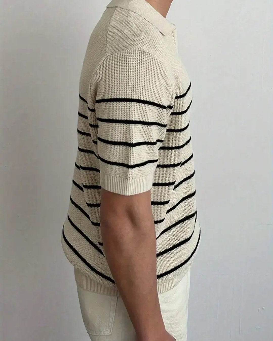 Camiseta casual con rayas horizontales beige y negro, ligera para oficina y ocasiones informales.